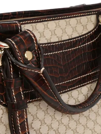 beige and brown canvas macadam pattern brown trim top handle outer pocket Condition: GOOD. This previously owned and used item is in good condition with minimal signs of use. This may include fading of material or plating and scratches.