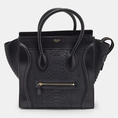 A modern classic. This version of Celine's iconic Luggage Tote comes in smooth black leather and exotic python panels. The curved lines and structured base keep the shape sharp while the size is perfect for days that demand a little more.