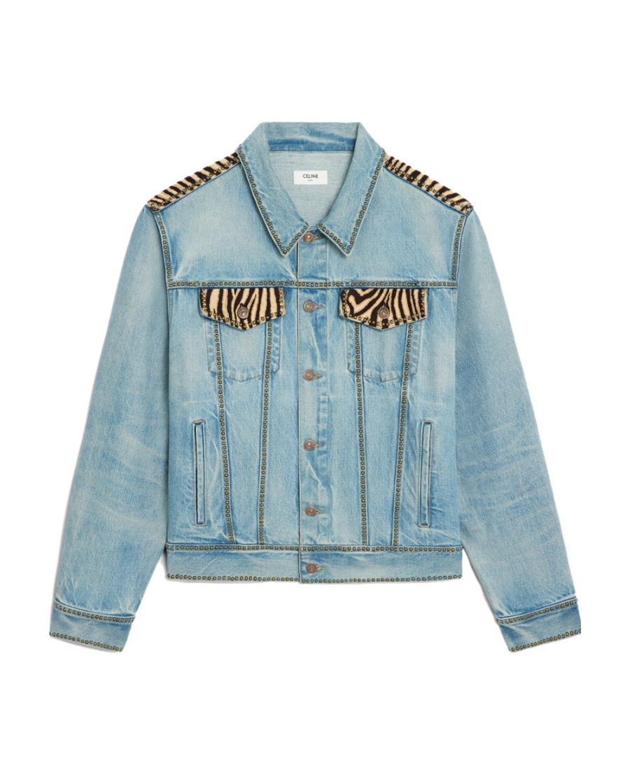 The shirt collar, front and back are embroidered with studs, oversized version, zebra print on the back and flip, two suit bags, two flip pockets on the chest, two adjustable loop belts at the waist and six buttons engraved with CELINE PARIS.