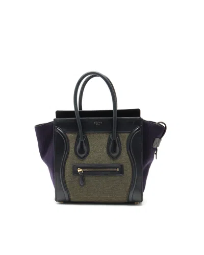 CÉLINE Luggage Micro Bag• Green canvas and purple wool with black leather trim• Gold-tone hardware• Dual rolled leather top handles• One external zip pocket• Black leather lining with one internal zip pocket and two slip pockets• Top zip closure• Protective feet at base• VintageOverall Preloved Condition: Good.Exterior Condition: Good. Light marks on the leather trim. Light wear on the corners and protective feet.Interior Condition: Good. The lining shows marks and scuffs.Hardware: Shiny with light scratches and some tarnish on the protective feet at the base.Delivered with dust bagMade in ItalyDimensions:Height 26 cmWidth 27 cmDepth 14 cmHandle drop 12 cmPlease note that the majority of our items are vintage and therefore have tales to tell unless stated otherwise. Therefore, please look at pictures, descriptions and measurements provided as they give you the best idea of the story this item has to tell.* Please note that when you buy a vintage product, the dimensions may vary slightly from a new one depending on previous care and storage.