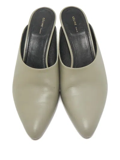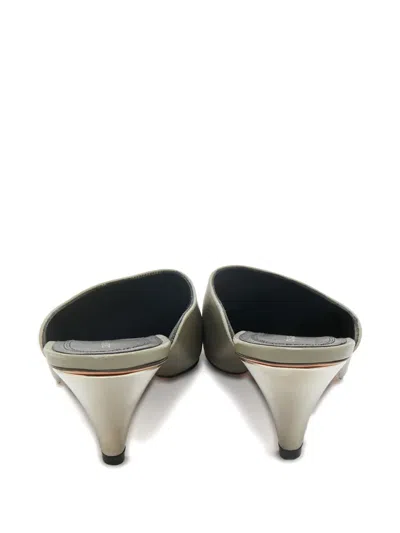 grey leather pointed toe cone heel slip-on style Condition: GOOD. This previously owned and used item is in good condition with minimal signs of use. This may include fading of material or plating and scratches. This piece comes complete with a protective dust bag.