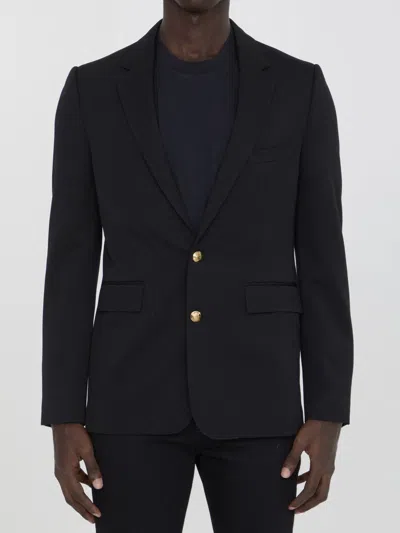 This single-breasted jacket offers a classic and refined look, crafted from luxurious virgin wool. Its design ensures versatility and timeless style for any wardrobe. With a focus on quality materials, itâs perfect for both formal and casual settings. Lapel collar for a sophisticated appearance Two front flap pockets and a chest pocket Back slit hem for ease of movement Composition: 48% cupro, 100% wool, 52% viscose | Celine Men's Single-Breasted Virgin Wool Jacket in Black | Size 48 | 2V481092D Color 38NO