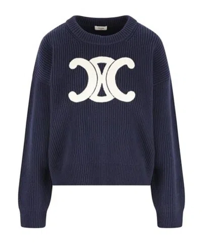 Celine Triomphe Blue Wool Pullover. Crafted from knitted navy blue wool, crew neck, contrasting white Triomphe patch on the chest, dropped shoulders, long sleeves, ribbed edges, loose fit.