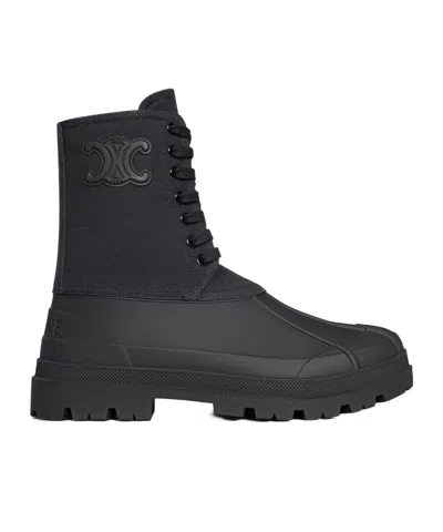 Celine Black Canvas Triomphe Boot. Pure black canvas boots, round toe, top tonal lace-up fastening, ankle-high, side tonal signature logo, back embossed lettering logo, tonal rubber sole.