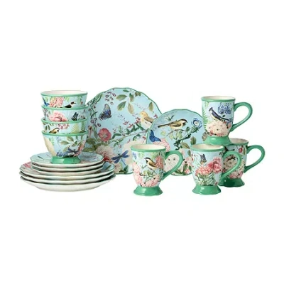 A stunning blend of practicality and artistic charm. Featuring a vibrant, colorful tableware design inspired by nature, this floral dinnerware set includes delicate hues of green, blue, and yellow, accented by butterfly and dragonfly motifs. Crafted from high-quality ceramic, the pedestal base of the bowls and mugs adds elegance and functionality, creating a sophisticated statement at every meal. Perfect for casual dining or entertaining guests, this durable dinnerware is designed to elevate your kitchen essentials. Its artistic floral patterns bring a vibrant and inviting touch to your table, while its thoughtful design makes it a giftable dinnerware set ideal for housewarmings, weddings, or holidays.# Pieces In Set: 16Included: 4 20 oz. Bowl(s), 4 18 oz. Mug(s), 4 8 1/2 Inch Salad Plate(s), 4 10 1/2 Inch Dinner Plate(s)Features: Microwave Safe, Dishwasher SafePlace Setting: Service for 4Shape: RoundBase Material: 100% CeramicCare: Dishwasher SafeDecor Styles: TraditionalMaterial: CeramicCountry of Origin: Imported
