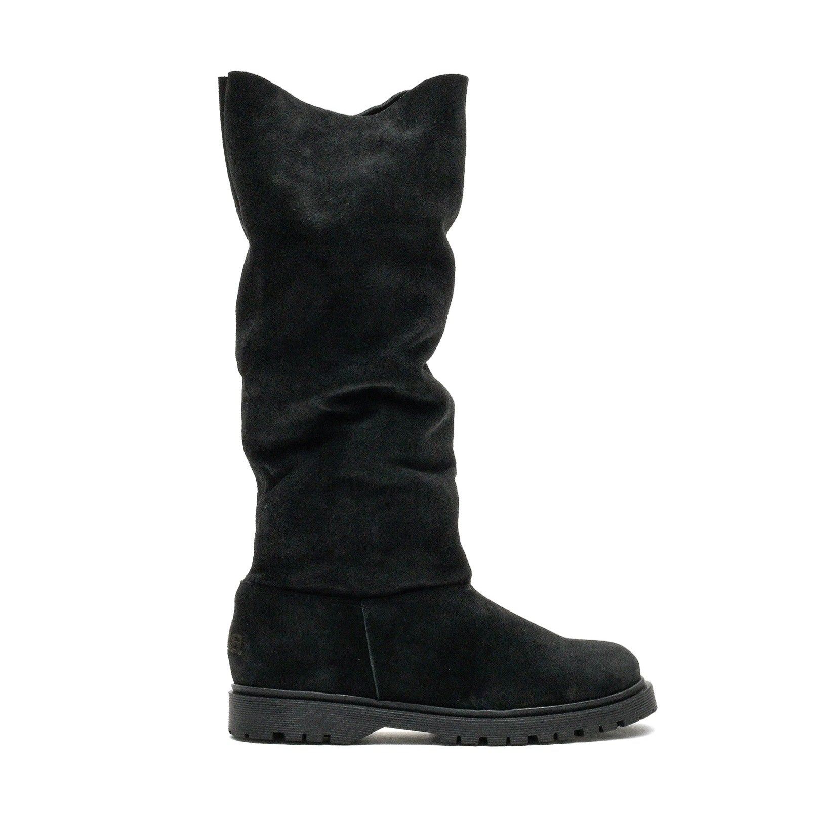 The Basic Baggy Tall Black is a timeless tall suede boot with a loose shaft that softly rests around the ankles, creating a relaxed and effortless look. Handcrafted from premium Spanish suede and lined with 100% Italian merino wool around the feet, it offers exceptional comfort and warmth like walking in sneakers. Finished with a polyurethane sole for support, a subtly leather-covered heel for contrast, and bronze nickel-free studs, this versatile black boot keeps its shape with reinforced heel and toe, making it perfect for everyday wear. Gently brush with a soft suede brush to remove dust If the suede gets wet, let it dry naturally Remove stains using a suede cleaner Do not machine wash or tumble dry