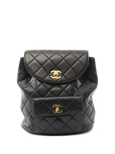 circa 00's black lambskin diamond-quilted front flap closure signature interlocking CC turn-lock fastening two leather and chain-link shoulder straps main compartment multiple internal slip pockets internal logo stamp full lining front flap pocket gold-tone hardware Condition: GOOD. This previously owned and used item is in good condition with minimal signs of use. This may include fading of material or plating and scratches.