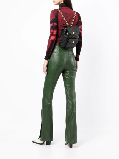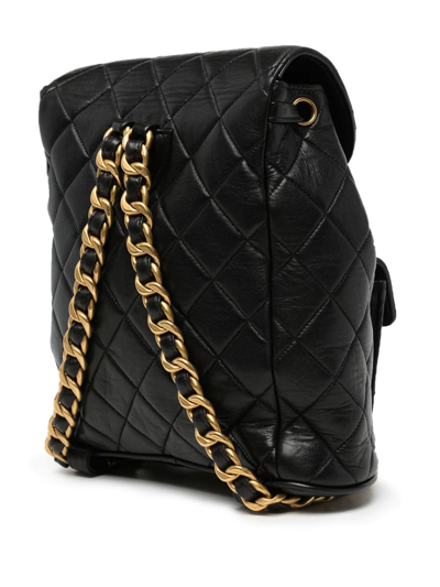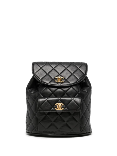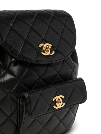 1994-1996 medium Duma backpack from Chanel Pre-Owned featuring black, lambskin, diamond quilting, foldover top, signature interlocking CC turn-lock fastening, drawstring fastening, two leather and chain-link shoulder straps, front flap pocket, signature interlocking CC turn-lock fastening, internal logo stamp, leather lining, gold-tone hardware, bucket body, circa 1994-1996 and Serial Number: 3365728. This item comes with an original Chanel authenticity card.. POSITIVELY CONSCIOUS: Purchasing this item continues its narrative and reduces the environmental impact of using new resources. You can be confident that you’re making a better choice for the Planet..