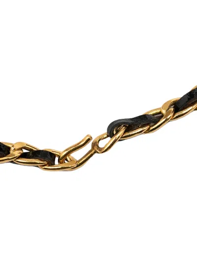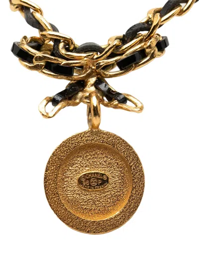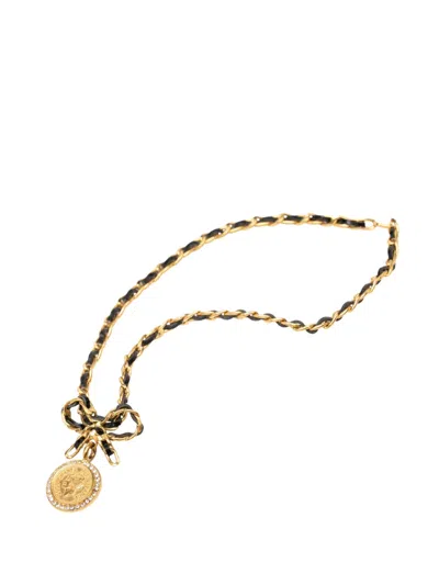 Pre-owned 1996 Leather And Gold Plated Medallion Bow Pendant Necklace Costume Necklace In Black
