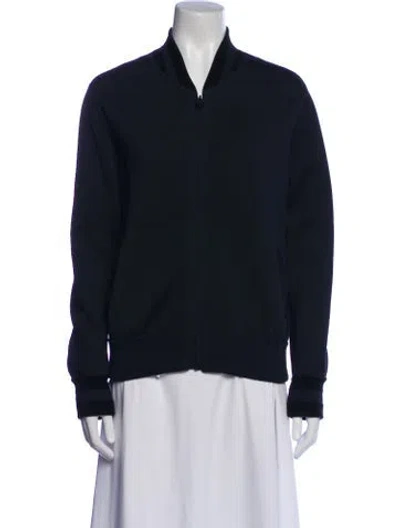Chanel Bomber Jacket From the Pre-Fall 2017 Collection by Karl Lagerfeld Black & Blue Interlocking CC Logo Stand Collar Zip Closure Designer Fit: Designed for a slim fit, those with a curvy figure may wish to take one size up. | Chanel 2017 Bomber Jacket in Black/Blue, Women's US8, FR40 | M