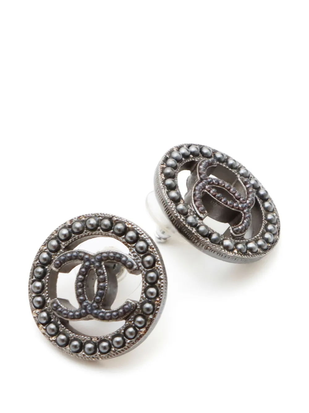 circa 2017 silver plated brushed finish circular design studded trim signature interlocking CC logo post-back fastening for pierced ears These earrings come as a pair. Condition: GOOD. This previously owned and used item is in good condition with minimal signs of use. This may include fading of material or plating and scratches. Purchasing this item continues its narrative and reduces the environmental impact by avoiding the use of new resources needed to make the product from scratch, such as water, materials and electricity, and avoiding additional manufacturing impact. Learn more about what makes a product Conscious on our Conscious Criteria page