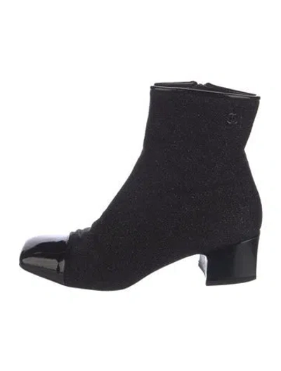 Chanel Ankle Boots From the Fall/Winter 2017 Collection by Karl Lagerfeld Black Interlocking CC Logo Patent Leather Trim Square-Toes with Glitter Accents Exposed Zip Closure at Sides Includes Box & Dust Bag Fit: This style typically runs a full size small. | Chanel 2017 Interlocking CC Logo Boots in Black, Women's IT 38.5 | 8.5