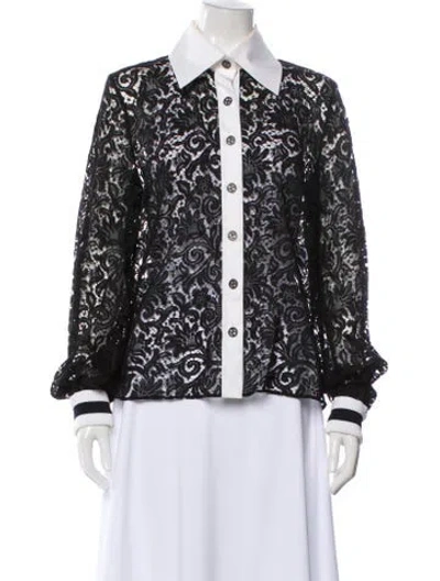 Chanel Blouse From the Pre-Spring 2017 Collection by Karl Lagerfeld Black Interlocking CC Logo Long Sleeve with Collar Button Closure at Front Designer Fit: Designed for a tailored fit, recommend taking one size up. | Chanel 2017 Lace Pattern Blouse in Black, Women's US6, FR38 | M