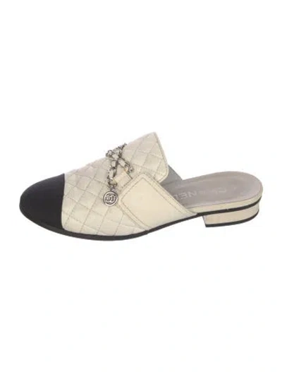 Chanel Lambskin Mules From the 2018 Collection by Karl Lagerfeld Black & White Interlocking CC Logo, Quilted Pattern & Chain-Link Accent Semi-Pointed Toes with Grosgrain Trim Includes Dust Bag Designer Fit: This style typically runs narrow and a half size to a full size small. | Chanel 2018 Interlocking CC Logo Mules in Black/White, Women's IT 37 | 7