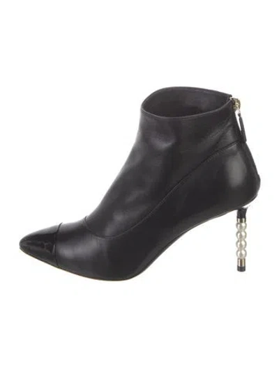 Chanel Leather Ankle Boots From the Cruise 2020 Collection by Virginie Viard Black Interlocking CC Logo & Faux Pearl Accents Patent Leather Trim Pointed-Toes Exposed Zip Closure at Ankles Fit: This style typically runs a full size small. Unfortunately, due to restrictions, this item may not be eligible for shipping in all areas. | Chanel 2020 Interlocking CC Logo Boots in Black, Women's IT 39 | 9