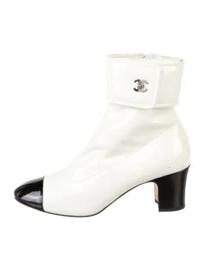 Chanel Patent Leather Ankle Boots From the Cruise 2020 Collection by Virginie Viard White Interlocking CC Logo Round-Toes Wrap-Around Straps & Exposed Zip Closure at Sides Fit: This style typically runs a full size small. | Chanel 2020 Interlocking CC Logo Boots in White, Women's IT 40 | 10