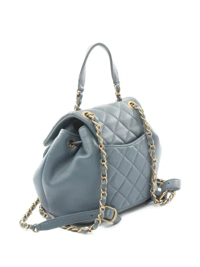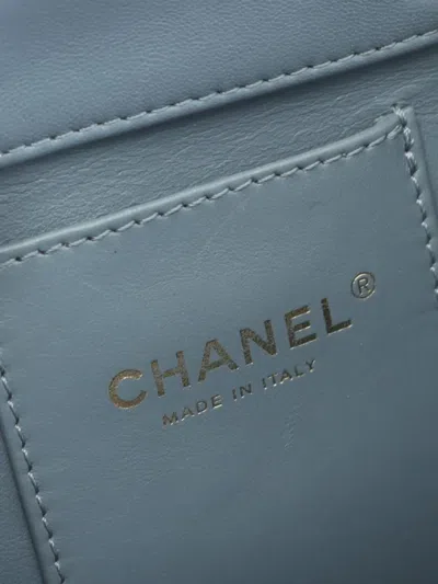 circa 2021 steel blue lambskin diamond quilting single top handle two adjustable leather and chain-link shoulder straps front flap closure signature interlocking CC turn-lock fastening top drawstring fastening main compartment internal slip pocket internal logo stamp two front patch pockets rear patch pocket gold-tone hardware Serial Number: EPH5TL27 Condition: EXCELLENT. This previously owned item is in near-perfect condition with no signs of damage or use.