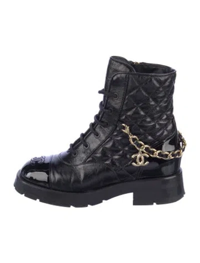 Chanel Leather Ankle Boots From the 2022 Collection by Virginie Viard Blue Interlocking CC Logo, Quilted Pattern & Chain-Link Accent Patent Leather Trim Round-Toes Lace-Up Closure at Uppers Fit: This style typically runs a full size small. Unfortunately, due to restrictions, this item may not be eligible for shipping in all areas. | Chanel 2022 Interlocking CC Logo Boots in Blue, Women's IT 36 | 6