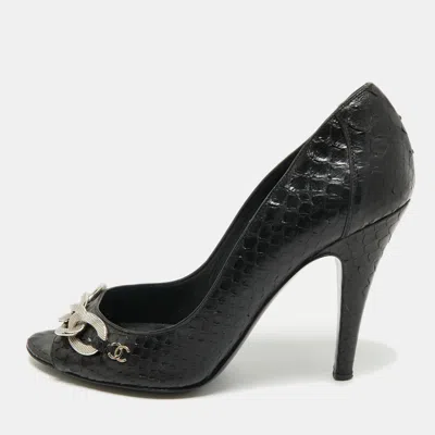 Pre-owned Black Python Cc Chain Link Detail Open Toe Pumps Size 38