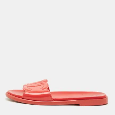Pre-owned Cc Size 40 Coral Orange Patent Leather Slide Flats