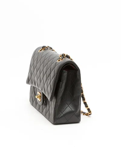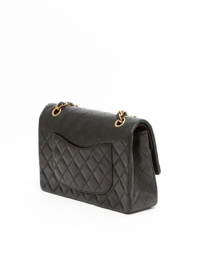 CHANEL Classic Medium Double Flap Bag- Gold-tone hardware- Black quilted leather- Interwoven leather and chain strap- Burgundy leather lining with a double flap- CC turn-lock closure- VintageOverall Preloved Condition: Good.Exterior Condition: Very Good. Faint scratches and indentations on the leather.Interior Condition: Very Good. Light scratches throughout lining.Hardware: Dull with scratches.Delivered with serial number tag, authenticity card, dust bag, boxMade in FranceDimensions:Height 15.5 cmWidth 25.5 cmDepth 6.5 cmHandle drop 24 cmStrap drop 42 cmPlease note that the majority of our items are vintage and therefore have tales to tell unless stated otherwise. Therefore, please look at pictures, descriptions and measurements provided as they give you the best idea of the story this item has to tell.* Please note that when you buy a vintage product, the dimensions may vary slightly from a new one depending on previous care and storage.
