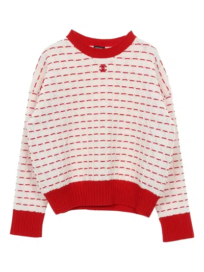 white crew neck knitted design ribbed hem and cuffs coco mark motif Condition: EXCELLENT. This previously owned item is in near-perfect condition with no signs of damage or use.