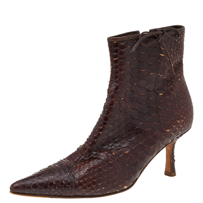 Pre-owned Dark Brown Python Leather Pointed Toe Ankle Length Boots Size 38.5