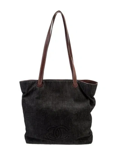 Chanel Tote From the 1997-1999 Collection by Karl Lagerfeld Vintage Black & Brown Denim Interlocking CC Logo Gold-Tone Hardware Flat Handles & Dual Shoulder Straps Embroidered Accent & Single Exterior Pocket Grosgrain Lining & Dual Interior Pockets Snap Closure at Top | Chanel Denim CC Tote in Black/Brown