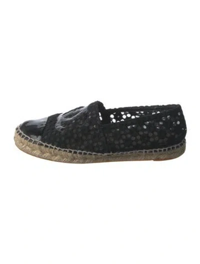 Chanel Mesh Espadrilles Black Interlocking CC Logo Patent Leather Trim Leather & Embroidered Accents Round-Toes Platform Designer Fit: This style typically runs narrow and a half size to a full size small. | Chanel Interlocking CC Logo Mesh Espadrilles in Black, Women's IT 39 | 9