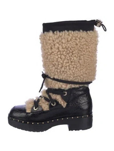 Chanel Shearling Mid-Calf Combat Boots Black & Neutrals Interlocking CC Logo Calfskin Trim Round-Toes with Studded Accents Wrap-Around Straps & Lace-Up Closure at Uppers Fit: This style typically runs a full size small. | Chanel Interlocking CC Logo Shearling Combat Boots in Black/Neutrals, Women's IT 37 | 7