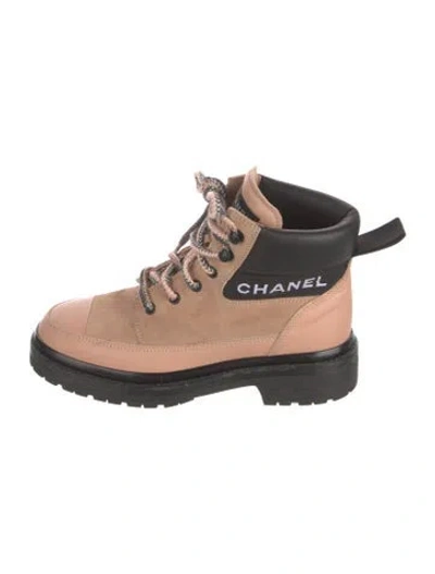 Chanel Suede Ankle Combat Boots Black & Pink Interlocking CC Logo Round-Toes Lace-Up Closure at Uppers Fit: This style typically runs a full size small. | Chanel Interlocking CC Logo Suede Combat Boots in Black/Pink, Women's IT 37.5 | 7.5