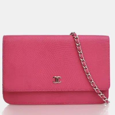 A compact Chanel WOC in pink lizard embossed leather featuring the CC logo and a classic chain strap. Lightweight and structured with room for cards phone and small essentials.