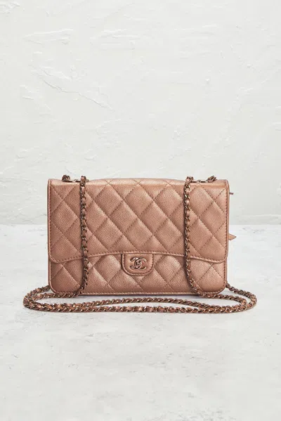 chanel Chanel Wallet On Chain in Bronze - Metallic Bronze. Size all. Brown calfskin leather with bronze-tone hardware. Made in Italy. Snap closure. One main compartment. 6 Interior credit card slots, 2 Interior flat pockets, 2 Interior zip pocket. Measures approx 7.5 W x 5 H x 1.5 D Shoulder strap with a 13 drop. Excellent. No significant wear or flaws. Original brand box, dustbag, authenticity card, and hang tag not included. FNEF-WY7150. 12130521. About the designer: