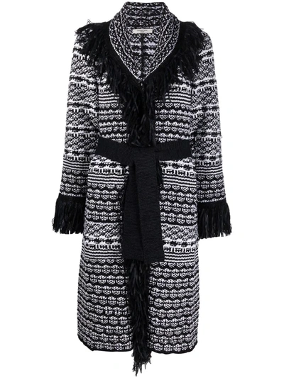 black/white wool intarsia knit shawl lapels fringed edge long sleeves tied waist straight hem. Colour. : Black, White. Composition. : Polyamide: 100.0%, Wool: 100.0%. Country Of Manufacture. : Afghanistan. MPN. : 665100CAMPI. .