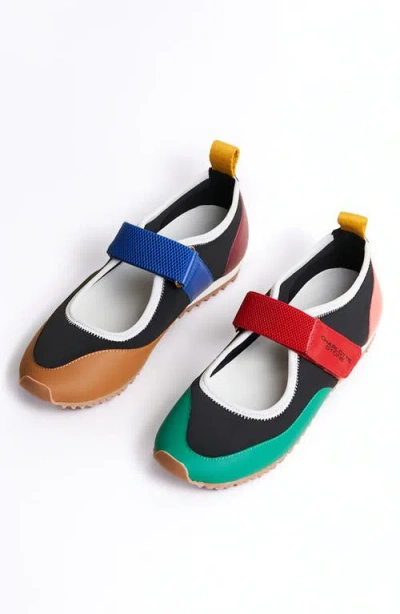 A multicolored, mismatched ballerina-sneaker hybrid with sporty touches. Leather, Neoprene, and Rubber uppers 0.75" heel height Rubber outsoles Adjustable soft woven elastic and velcro strap