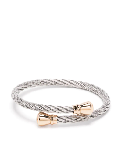 Silver-tone/gold-tone steel Celtic cable bangle from Charriol featuring slip-on style, adjustable fit and twisted cable design.