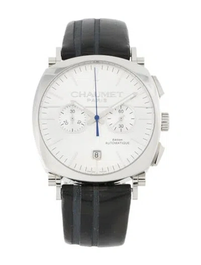 Dandy Collection40mm x 49mm Case Dimensions Stainless Steel Featuring Automatic Movement with Chronograph & Date Complications Smooth Bezel Silver Dial Black Leather Strap Butterfly Clasp Includes Collateral | Chaumet Dandy Watch