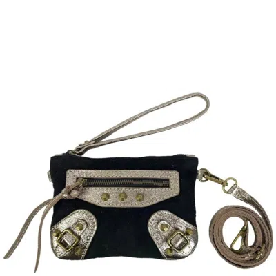 Lipstick, check. Mints, check. Credit card, check. The cutest little bag that holds all of your necessities.Elevate your style with the Suede Leather Wristlet with Decorative Studs by Chenson & Gorett, a chic accessory that seamlessly blends sophistication and glamour. Made from supple suede leather and adorned with eye-catching decorative studs, this black wristlet serves as a perfect companion to any outfit. It features a main zipper closure and a lined interior with a side pocket for additional organization. Sized at 19 x 1 x 14 cm, it is crafted in Italy and includes a short handle along with an adjustable and removable shoulder strap for versatile wear.