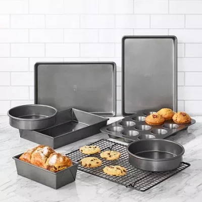 At Chicago Metallic, we believe that serious baking requires serious bakeware. That��s why we��re proud to offer distinct lines of premium bakeware, plus stylish, innovative specialty bakeware and baking essentials for professionals and serious home bakers. This Professional Series 8-Piece Bakeware Set includes all the essential pans for making your favorite baked goods. Pans are made of heavy-duty carbon steel with a nonstick coating for easy release. 8-piece set includes: loaf pan, two 14-3/4 x 9-3/4-inch baking sheets, 12-cup muffin pan, two 8-inch round pans, 16-1/2 x 11-1/2-inch cooling rack, and 9 x 13-inch cake pan. Dishwasher safe; handwashing recommended to extend the life of the products. # Pieces In Set: 8Included: 1 9 X 13 Inch Cake Pan(s), 2 8 Inch Round Cake Pan(s), 1 12-Cup Muffin Pan(s)Features: Dishwasher SafeManufacturer Warranty: Lifetime LimitedMeasurements: 18.3 Depth/InchesMaximum Temp (f): 450 Degrees FCare: Dishwasher SafeMaterial: SteelCountry of Origin: Imported