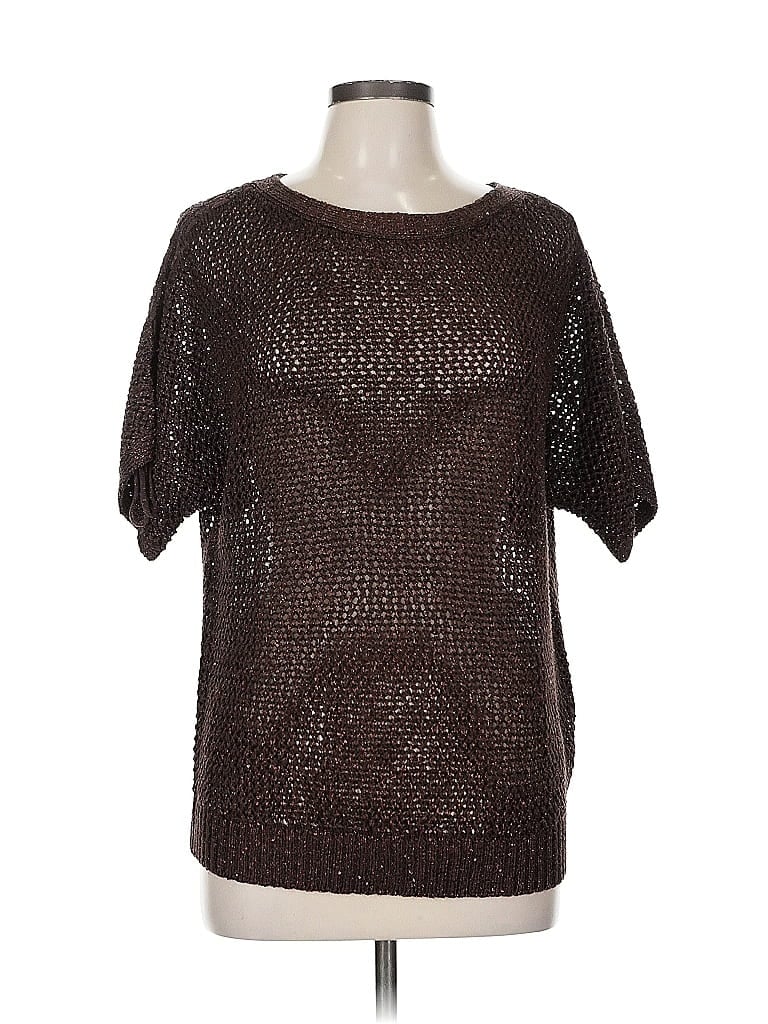 Chico's Pullover Sweater, Size: Medium. Item Details: Brown, Metallic Pattern, Scoop Neck, Short Sleeve, Women's Tops, Polyester/Cotton/Metallic