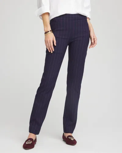 The Brigitte™ Slim Pull-On Pants are an iteration of our bestselling silhouette showcasing a jacquard stripe. Customers love our So Slimming® Brigitte Ankle Pants so much that we've added a new slim-fit, full-length style to the collection. Like all So Slimming® Brigitte pants, the full-length design features our exclusive Hidden Fit shapewear technology for a figure-trimming fit. Cut from soft fabric with just the right amount of stretch for all-day comfort. Stretch-and-recovery fabric with exclusive 180-degree Hidden Fit technology that slims and shapes. Classic-rise pull-on pants with front pockets and faux back pockets. Regular Inseam: 30.5", Tall Inseam: 33.5".75% , 22% Nylon, 3% Spandex. Machine wash cold. Imported. Online exclusive." | Women's Shadow Stripe Brigitte Slim Pull-On Pants in Blue | Chico's