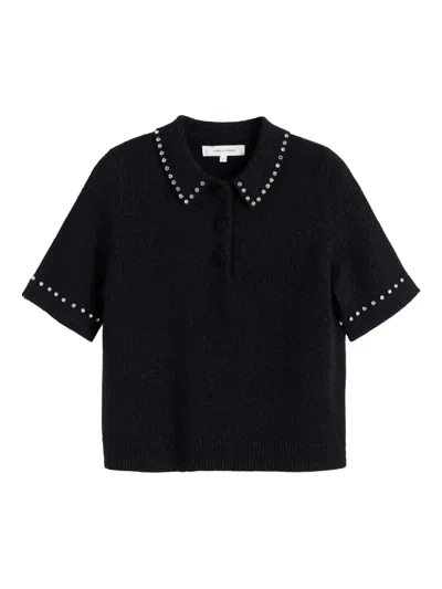 Chic, playful, and party-perfect - this merino and cashmere blend knit top brings vintage charm to modern dressing. Featuring a contrast scalloped collar and statement buttons, it's designed for effortless elegance with a touch of fun. Classic Fit True to size Model is 5ft 10in and wears a UK size 8/Small. To learn more about our fits and sizing please read our Fit Guide. DETAILS KAW25102 95% Wool, 5% Cashmere Crystal stud embellishments at collar and cuffs Front placket with tonal buttons Ribbed hem for gentle structure Covered buttons at front placket Black MEASUREMENTSThe model is wearing a UK size 8 / Small. The measurements provided are for size Small. Chest - 45.5cm Length - 52cm Across Shoulder - 33.5cm Sleeve Length - 25cm Waist - 44cm CARE Hand wash or dry clean Do not tumble dry Do not bleach Cool Iron SUSTAINABILITYThis garment was made in China