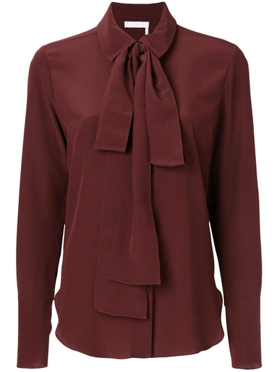 Charged with blithe seventies spirit, French fashion house Chloé combines the romanticism of nostalgic femininity with the unruffled elegance of Parisian chic. Crafted from deep rum raisin silk crepe, this delicate shirt serves up fluid lines, its classic collar topped with a pussy bow fastening, the design finished with long sleeves, button cuffs and slits to the sides.