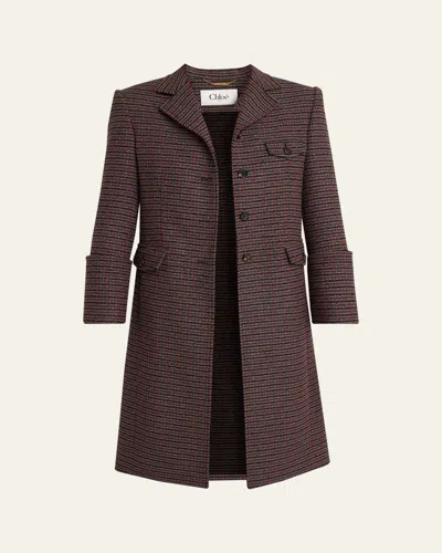 Chloe singlebreasted riding coat in classic houndstooth for a timeless look, embellished with engraved horn buttons Notched lapels; button front Long sleeves Chest flap pocket Front flap pockets Back vent Mid length Virgin wool/nylon/polyamide/horn Lining: Viscose/cotton Dry clean, professional cleaning recommended Imported