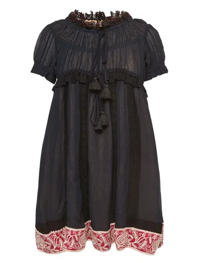 midnight blue cotton-silk blend semi-sheer construction gathered tie neck lace trim ruched detailing short puff sleeves flared skirt contrasting trim at the hem contrast lining Condition: UNWORN. This item is previously owned but remains unworn and in its original condition. However, it does not come with its original tags.