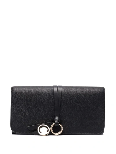 Black leather/cotton logo continental wallet from CHLOÉ featuring logo plaque, foldover top, card slots and internal zip pocket.