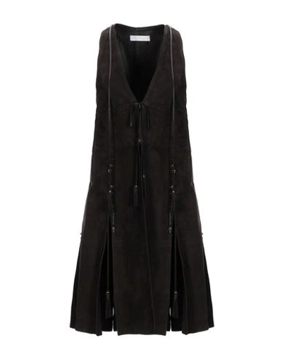 leather, suede effect, metal applications, tassels, solid color, hook-and-eye closure, multipockets, sleeveless, single-breasted , v-neck, unlined, contains non-textile parts of animal origin, single-breasted jacket, large sized , Color: Dark brown , Size: 4