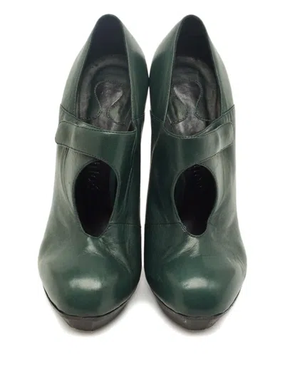 green leather platform high heel cut-out detail T-strap Condition: GOOD. This previously owned and used item is in good condition with minimal signs of use. This may include fading of material or plating and scratches.
