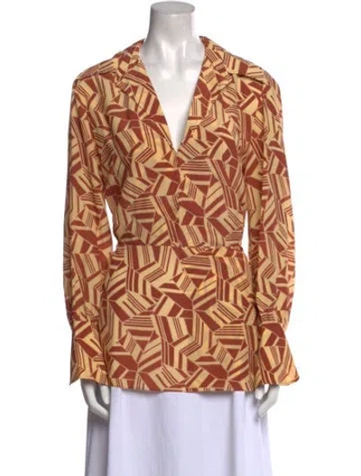 Chloé Silk Tunic Brown & Yellow Printed Long Sleeve with V-Neck Hook & Eye Closure at Front Designer Fit: Tops by Chloé typically fit true to size. | Chloé Silk Printed Tunic in Brown/Yellow, Women's US8, FR40 | M