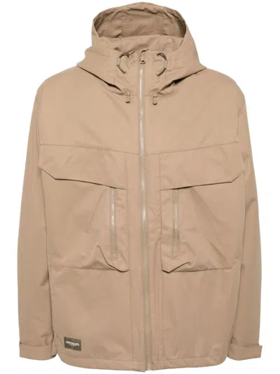 sand beige front zip fastening drawstring hood two front inset pockets two zip-fastening chest pockets long sleeves drop shoulder elasticated cuffs